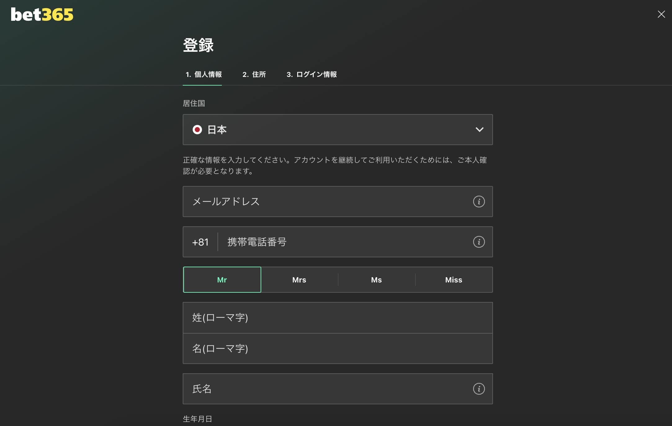 公式サイトにアクセス: Bet365の公式サイトにアクセスし、「今すぐ登録する」ボタンをクリックします。